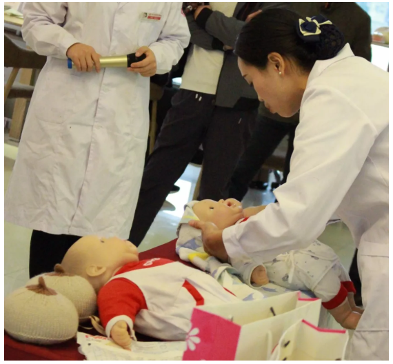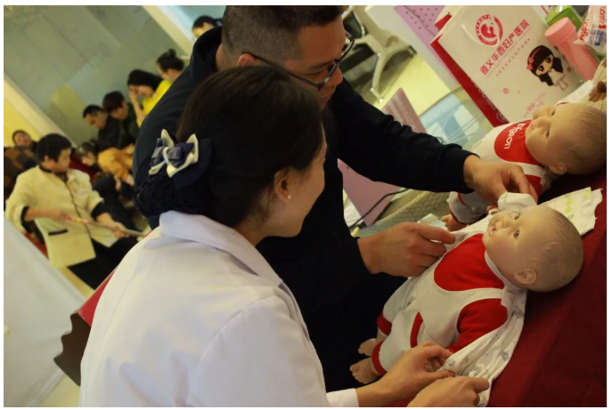 王燕护士长用自己丰富的知识,通俗易懂的讲解,赢得了准爸爸准妈妈们阵阵掌声。准爸爸还参与了现场实操环节。为该准爸爸点赞!